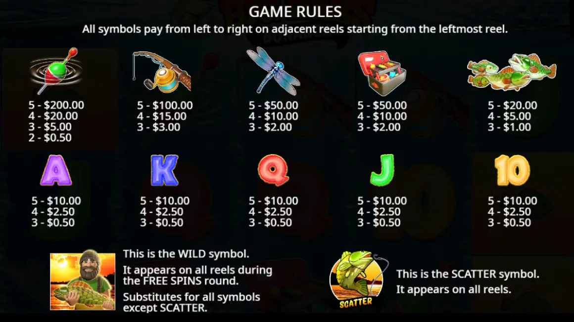 After placing your bet, hit the spin button and watch the colourful fishing symbols roll in. You win when you land matching symbols across paylines from left to right. 10, J, Q, K, and A card values represent the low-value symbols. The high-value ones are represented by fishing rods, tackle boxes and dragonflies.